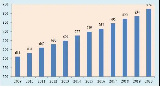 图片为2009年至2020年高校毕业生人数变化趋势图;自上世纪末进行大学扩招以来,高校招生人数从1998年的108万增至2020的874万,最新统计则显示,2021年的毕业生人数为909万。近年来,每年的高校毕业季都被部分媒体称为史上最难就业季。/图片来源:百度图片