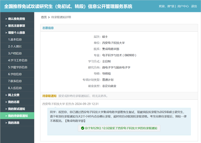 回首在大学的时光,有欢笑、有泪水,有拼搏、有收获。如今,我成功推免至西安电子科技大学攻读研究生。这一路走来,我衷心感谢那些给予我帮助的人,感谢师长的悉心教导、前辈的耐心指导、朋友的热情鼓励,感谢学院和学校为我提供的广阔平台。之后我将带着明确的目标继续奋斗,以更高的热情和更坚定的毅力迎接未来的挑战,努力为国家的发展贡献自己的一份力量,也祝愿每一位追逐梦想的你,都能勇敢地成为心目中的自己!