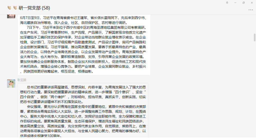 2021年6月19日晚上,研究生第一党支部根据上级精神,在线上认真学习贯彻《习近平总书记在青海考察期间重要讲话精神》。