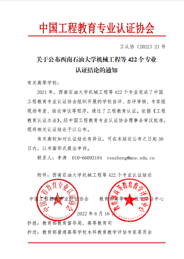 6月16日,中国工程教育专业认证协会和教育部高等教育教学评估中心联合发文《关于公布西南石油大学机械工程等 422 个专业认证结论的通知》(工认协〔2022〕21 号),正式公布了2021年工程教育专业认证结果。本年度共有422个工程教育认证。色情导航