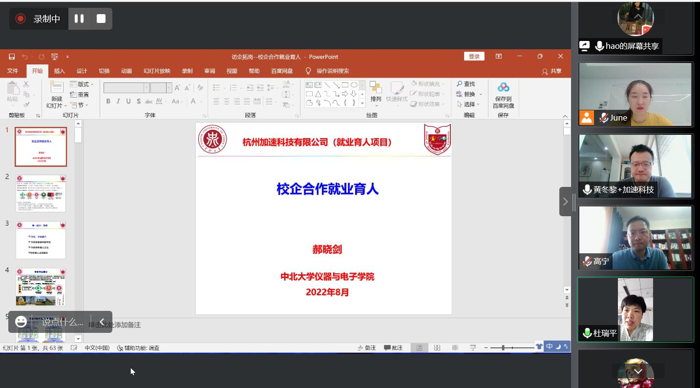 通过线上会议与杭州加速科技有限公司举行“访企拓岗”校企合作的交流。学院党委书记郝晓剑、副院长梁庭、微电子科学与工程专业负责人崔建功与杭州加速科技有限公司的负责人围绕校企合作、就业育人进行了专题交流。交流会由学院副书记杜瑞平以及杭州加速科技有限公司产业人才交付经理孔娟联合主持。