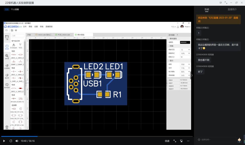 本次培训的主讲人为林瀚知,主要内容为对立创EDA软件与PCB的讲解。首先,林瀚知对立创EDA软件如何操作进行讲解,例如如何插入元件,如何编辑PCB布局等基础操作知识;然后,林瀚知从找寻所需原件、PCB生成到PCB布局与画线,以micro-USB点亮LED这一实例进行操作演示。之后,林瀚知以上学期学过的51单片机最小系统板为实例进行操作演示,重点演示如何选取所需元件,完成原理图后开始生成PCB,PCB板从布局到画线一气呵成,强调布局与画线的合理性与美观性。
