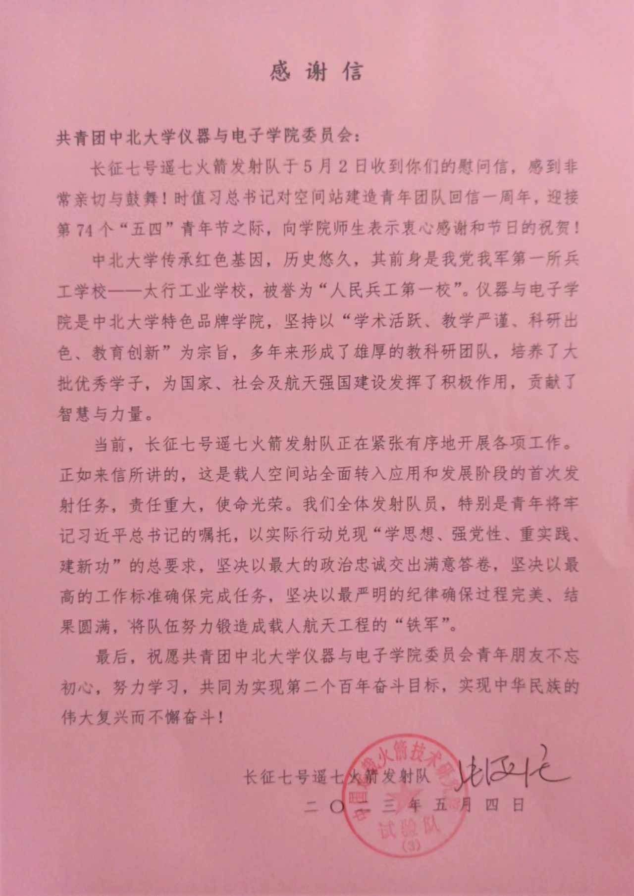 团委收到长征七号遥七火箭发射队回信,信中肯定了我校为国家、社会及航天强国建设发挥的积极作用,同时信中说到,全体发射队员将牢记习近平总书记嘱托,以实际行动兑现“学思想、强党性、重实践、建新功”的总要求,坚决以最大的政治忠诚交出满意答卷,坚决以最高的工作标准确保完成任务,坚决以最严明的纪律确保过程完美、结果圆满,将队伍努力锻造成载人航天工程的“铁军”。