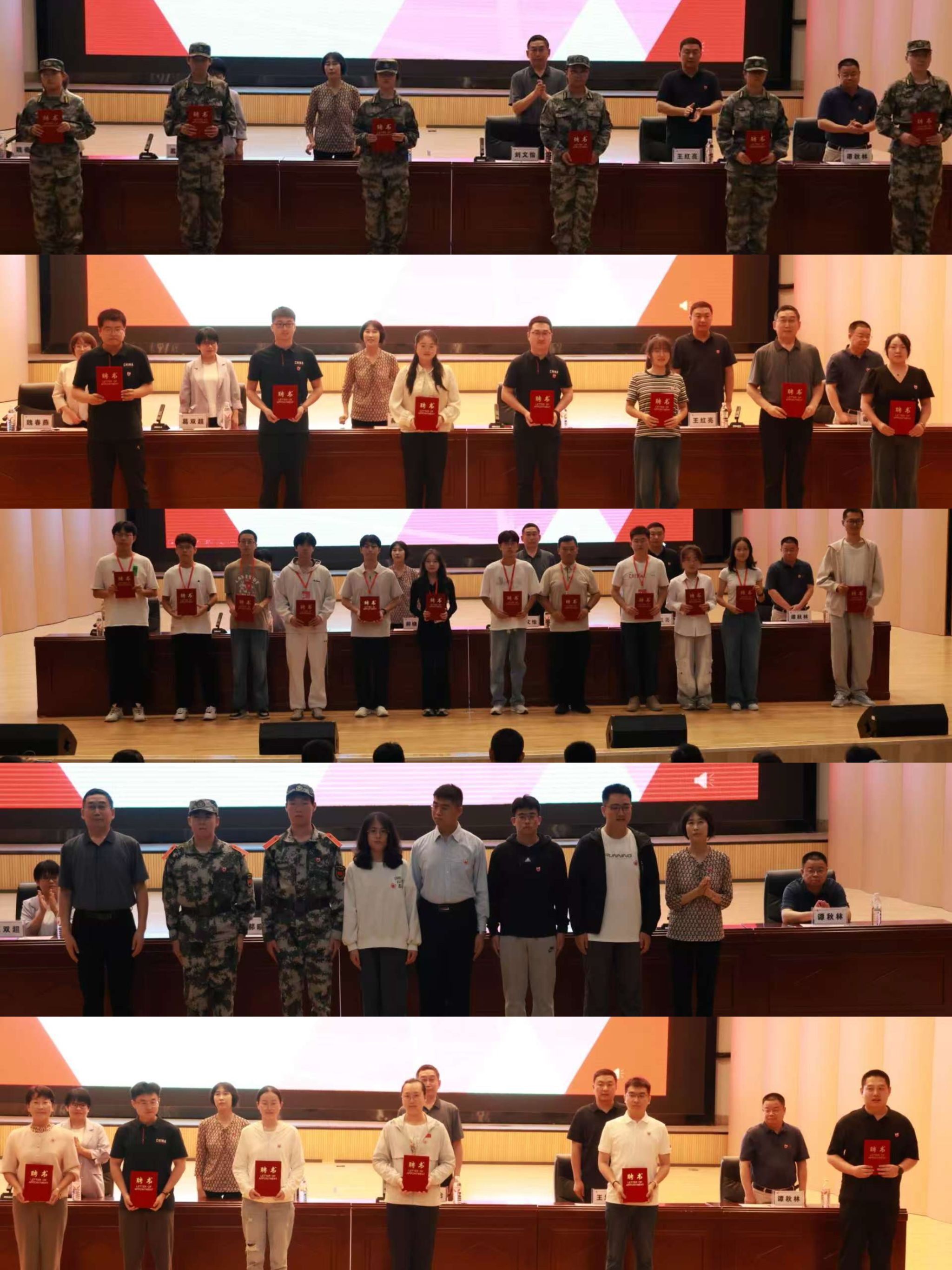 学院领导分别宣读2025级新生班主任聘任决定、新生朋辈导师聘任决定、军训教官聘任决定并颁发聘书。新生班主任代表、在校生代表、新生代表依次上台发言。