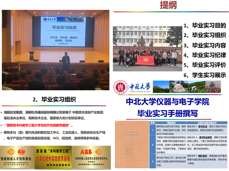 2024届测控技术及仪器专业、电子科学与技术专业共435名毕业生赴洛阳牡丹通讯股份有限公司进行毕业实习。进入实习单位后,根据实习计划安排,依次完成了企业生产现场观摩实习、《入厂安全教育及企业生产组织》、《元器件分类及识别》、《电子元器件焊接技术》、《电子产品生产工艺》、《生产现场质量管理》和《机器人工作原理讲解》课程理论授课,进行了电路板焊接练习、智能小机器人元器件焊接、调试、测试及组装的完整的过程。