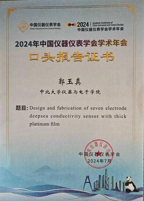 郭玉真同学在薛晨阳教授课题组老师们的培养下,依托课题组良好的学习科研氛围和先进的实验平台,围绕海洋环境动力学参量“卡脖子”传感技术开展创新研究,以负责人身份承担山西省研究生科研创新项目1项(在研)。目前共发表SCI高水平学术论文7篇,其中以第一作者身份发表SCI学术论文1篇,以学生第一作者身份申请国内发明专利4项。多次参加学术会议并进行口头报告,其中在2024中国仪器仪表学会学术年会的先进传感器与应用分论坛中口头报告《面向深海应用的厚铂膜七电极电导率传感器》,分享了团队在深海海洋环境测量领域的最新研究成果。