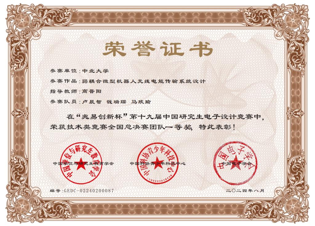 学业二等奖学金。研究方向为面向胶囊机器人的无线供能技术。研一下学期通过学校和学院相关文件了解到研电赛。经过与导师交流并得到导师支持后,便与团队成员钱瑞琛、马欣瑜积极备赛。团队参赛作品——弱耦合微型机器人无线电能传输系统设计,关注人民生命健康,旨在解决胶囊内镜供能问题的发展痛点,推动我国胃肠微无创诊察发展。在高晋阳导师的指导下,依托课题组多年研究成果,作品形成了具备电磁安全性发射线圈优化模型、具备温升安全性的有限空间接收线圈优化模型和机载新型电能管理电路三大创新点。在山东大学(青岛校区)华北赛区技术赛现场赛阶段,从华北地区48所高校的596支队伍脱颖而出晋级全国总决赛。