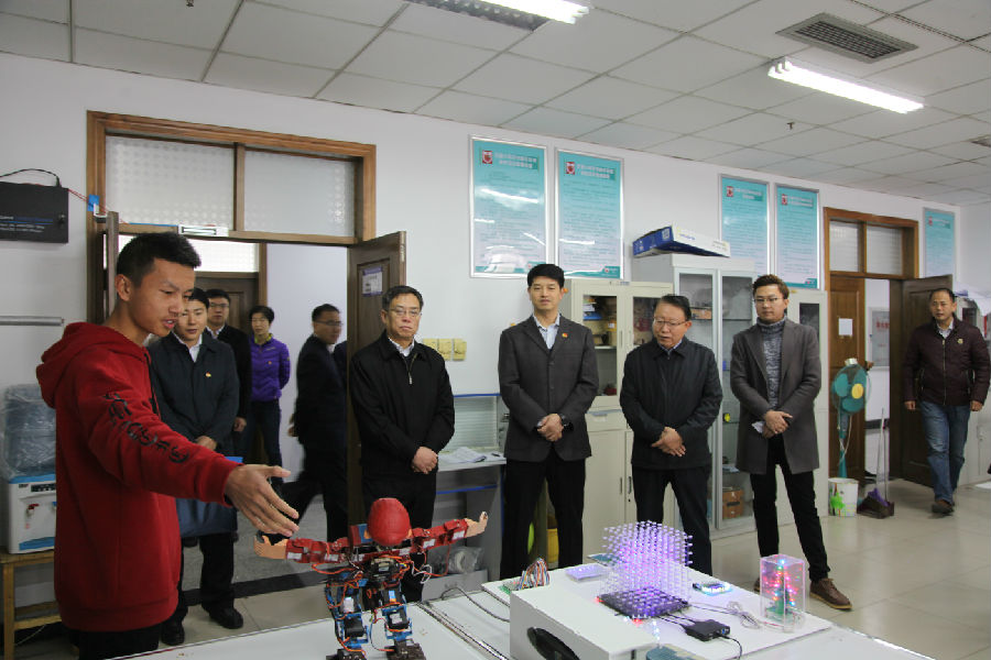 在随后的行程中,在王云峰同学的带领下黄书记参观了创新精英研究院的六个实验室,分别了解了各个实验室的特色发展方向。在仪器测量实验室,崔让同学展示了实验室的智能烘干毛巾架,身高测量仪等作品;在机器人实验室,王云峰同学展示了六足仿生机器人和舞蹈机器人;在数字信号实验室,撖子奇同学展示了钢琴机器人与智能小提琴;在物联网实验室,郭瑞卿展示了基于光通信的智能家居;在嵌入式实验室,周宇晨同学展示了倒立摆以及滚球控制系统;在智能车实验室,展示了飞思卡尔大赛的光电智能双车。黄书记仔细的聆听了同学们对各个实验室作品的讲解,并称赞了同学们的创意及热情。最后在同学与老师的依依不舍下,黄书记离开了研究院前往了下一目的地。