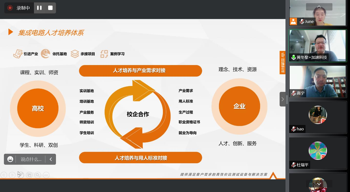 学院党委书记郝晓剑就学校和学院的情况、学院特色的育人方法和育人成效进行了详细介绍,并根据杭州加速科技有限公司是以集成电路测试产业为主攻方向的特点,就学院的集成电路科学与工程从培养方案、课程设置等方面进行交流。杭州加速科技有限公司产品总监黄冬黎、市场总监高宁分别就企业的产业政策、人才培养方案以及人才培养的案例进行分析。
