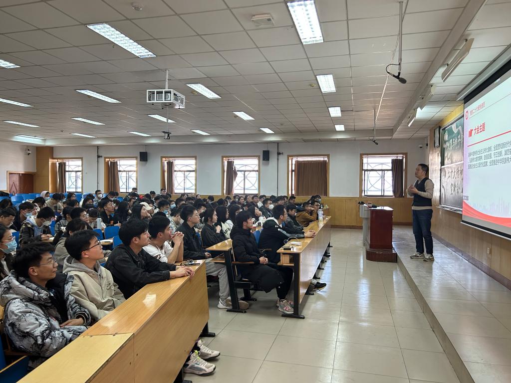 辅导员郭乐祥老师以《深学细悟党的二十大精神 踔厉奋发肩负青春使命》为题,在11508H教室,通过线上线下相结合的形式面向学院全体党员进行了宣讲。