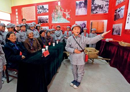 习近平总书记指出,沂蒙精神与井冈山精神、延安精神、西柏坡精神一样,是党和国家的宝贵的精神财富,要不断结合新的时代条件发扬光大。图为“小红军”讲解员到山东省沂南县红嫂纪念馆义务为游客讲解,弘扬沂蒙精神。