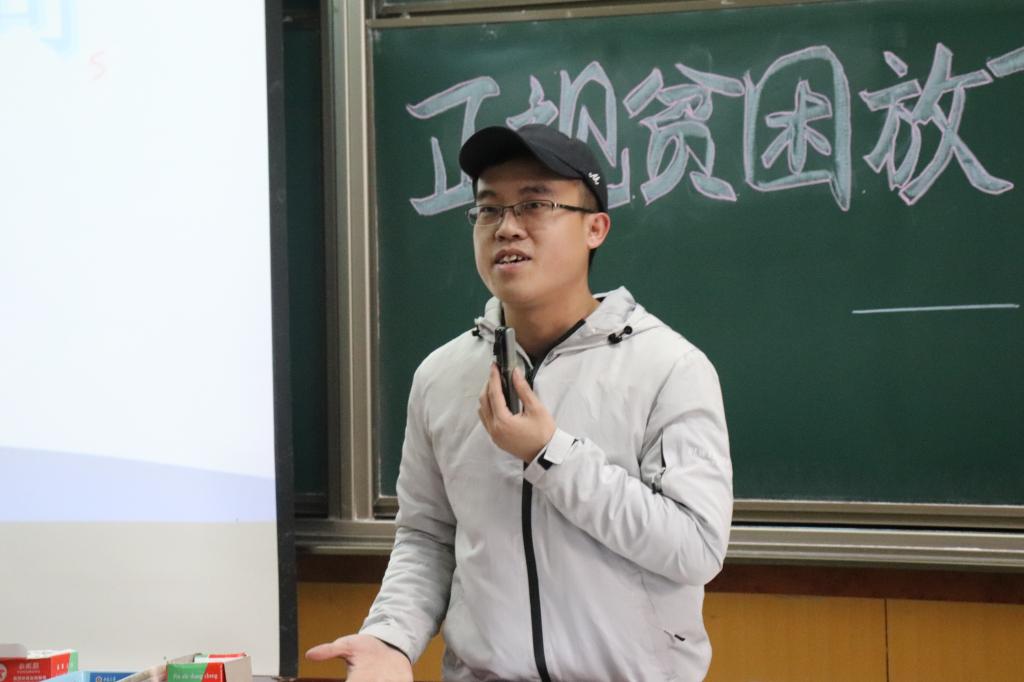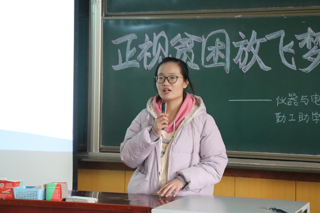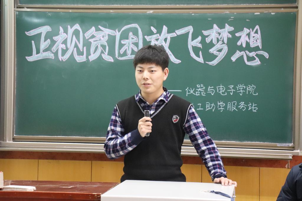 勤工助学励志视频,并通过“你画我猜”的游戏环节在欢笑中普及推广助困工作相关政策知识,讲解临时困难补助及学费减免和应征入伍学生资助内容。随后,闫兵学长和刘松涛学长就如何保研分享了自己的学习经历,鼓励大家从大一就重视学习,积极同老师和同学合作,在各项赛事中锻炼自我。在大会的尾声,学院学生科教师赵玉峰总结了助困工作及其意义,同时鼓励学生不忘初心,努力学习以此回报社会,并对大会做出总结。