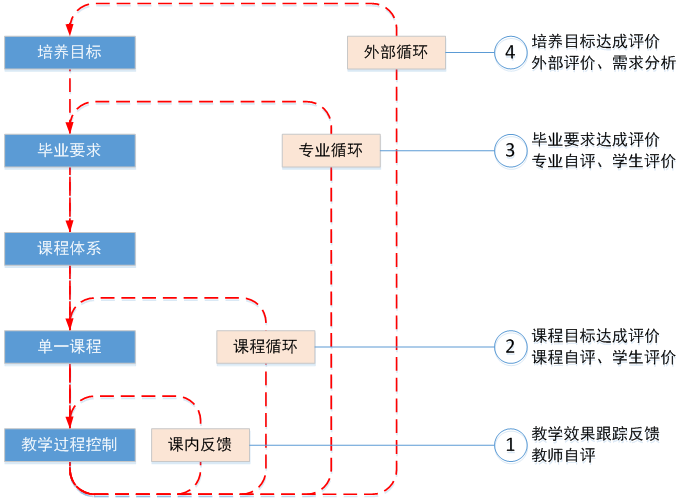 循环④是用来评价改进培养目标。前面三个循环都是在校内完成的,而循环④基于社会需求、已经工作五年的毕业生状态、用人单位意见以及毕业要求达成度评价建议对培养目标的达成情况进行评价和改进。该循环是对顶层设计的改进,需要结合学校内部和外部多方面的努力来完成。